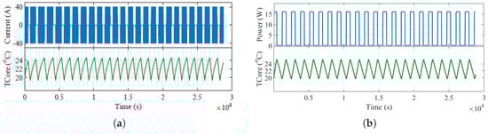Simulation results for C ambient temperature with (a) the APC method; (b) the HP. Current (blue) and battery cell’s core temperature (green) maintained between C and C.