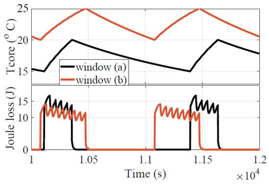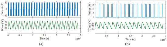 A closer look in Figure 10 shows the temperature behavior and the corresponding energy losses for windows (a) and (b) for a certain period of the experiment. It can be observed that, for the same applied current profile (amplitude, frequency and duty cycle), a higher internal resistance leads to a higher heat generation but for a shorter time needed to reach the temperature limit.
