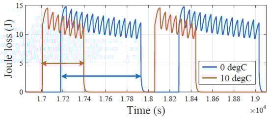 Figure 9 emphasizes the APC energy losses on the NMC cell’s core for the two ambient temperatures and a certain time frame of two pulses. As it can be seen, more Joule losses are generated in proportion to the required current to heat the battery. These losses are the potential energy expenses provided by the grid as explained in Equation (13), hence an energy cost higher is observed for a C ambient temperature. It is estimated that for C the energy cost accounts for 0.006 euro per 8 h case, whereas the double and triple cost is required for a colder weather condition at C and C.