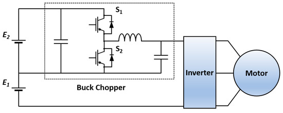 In recent years, global warming has been receiving more attention. One of the solutions is to increase the use of Electric Vehicles (EV), and several barriers to EV use have been investigated. One of the challenges is to establish the appropriate efficiency of the battery energy consumed by the powertrain [1,2]. Figure 1 depicts a typical powertrain [3] in which the DC energy in the battery is converted by inverters to AC energy, which is supplied to the motors. The inverter input voltage is fixed to the battery voltage; thus, the switching loss of the inverter is proportional to the input voltage. For inverter loss reduction, a series-chopper-type powertrain has been proposed [4,5]. In this design, a DC–DC converter is inserted between the battery and inverter, and the inverter input voltage is controlled by the chopper. As a result, in low-speed ranges, the input voltage is low, and in high-speed ranges, the input voltage changes according to the speed. The total efficiency of the powertrain becomes high only if the efficiency of the DC–DC converter is very high and the power rating is relatively large [6]. This paper describes a high-efficiency chopper-based powertrain. The content is organized as follows: Section 2 explains the proposed chopper-based powertrain. In Section 3, several case studies for driving range extension are shown using a motor test bench. Section 4 concludes the paper.