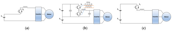 The two-battery HEECS chopper is based on partial power conversion, as shown in Figure 2. The chopper consists of two batteries and one buck-type chopper. Figure 3 shows the operation of the HEECS chopper in three ranges of speed. In the low- and high-speed ranges, the duty ratio of the chopper is 0 and 1.0, respectively. In these two operating modes, the output current from the battery flows only through a switch and the inductor. Therefore, the chopper loss is very low. In the middle-speed range, the buck chopper works, and the HEECS chopper outputs variable voltage depending on the speed.