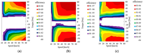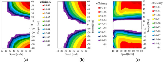 Efficiency maps of non-chopper powertrain: (a) Total efficiency; (b) inverter efficiency; (c) motor efficiency.