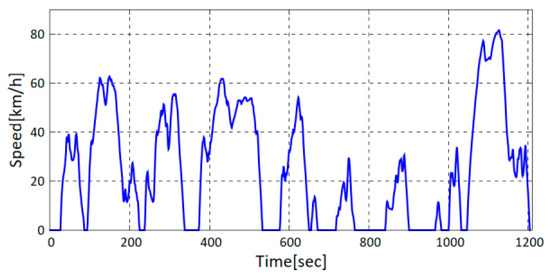 where v represents the motor speed [km]. For this case study, E1 + E2 = 350 V, and the in-wheel motor can rotate at 83 km/h without any additional control. Then, the flux-weakening control begins to work at rotations greater than 83 km/h, and the in-wheel motor can then rotate over that speed. Equation (3) was empirically selected, and the parameters E1 and the gradient that responds to the speed were determined by a trial-and-error approach in the 10–15-mode and JC08-mode driving test cycle.