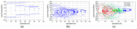 Torque–speed maps of the driving cycles: (a) 10–15 mode; (b) JC08 mode; (c) WLTC mode.