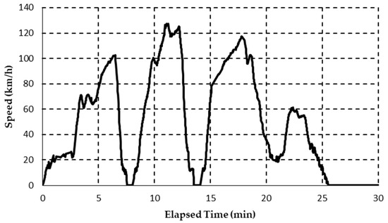 Cyclic energy and power demand can be calculated using drive cycle. For our work, UPE drive cycle was extracted using the “Speed Tracker” mobile application with a one second data-sampling rate as shown in Figure 2. This application uses the global positioning system (GPS) data to save the time-dependent velocity of the vehicle on its path. In UPE route, each trip takes 25.5 min and the train has 10 min of idling at the Union and Pearson stops. From the graph, it turns out that the maximum train speed on the route is 127 km/h, which corresponds to the train specification information [25].