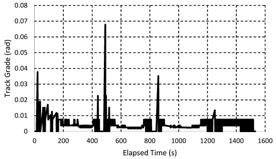 To calculate the weight of the train, it was assumed that the passengers have an average weight of 65 kg (per person). A C-car configuration is modeled in this study. As a result, the train should be able to transfer 175 (3 × 58 + 1) passenger in each trip [28]. It is also assumed that each passenger carries a 5 kg load into the car. Hence, the total weight of a full train can be estimated as 236,779 kg. Moreover, Equation (5) was used to calculate the track grade from Figure 4.