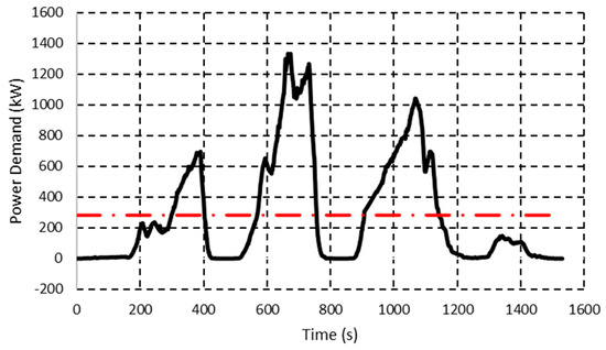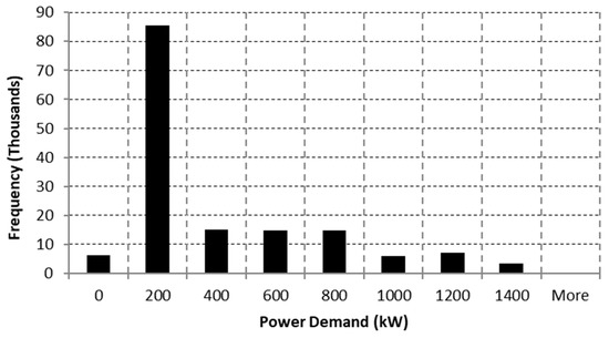 To analyze the route power demand, a histogram of the power demand during each journey is calculated and shown in Figure 7. As can be seen, the most frequent part of the power demand occurs below the mean power of 283.3 kW and is shown in Figure 5 with a red line. In the next part of this study, we used the mean power as a design criteria value to conceptualize an appropriate topology for the mentioned drive cycle. This would be a good option since the value differs between different routes and can be used in conceptual design step for any individual route.