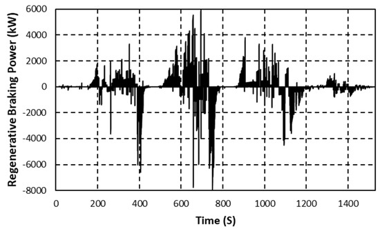 Figure 5 shows the calculated power demand for trains working in the UPE route. It can be seen that the train motion has three different modes: acceleration, deceleration, and idling. The braking events were identified as the regions with negative acceleration slope. To estimate the corresponding braking power, for each two successive time instants within the braking region, the difference in power demand due to the grading resistance change was subtracted from the difference in total power demand. This wasted power can be partly recovered as regenerative braking where the battery is partially charged Figure 6.