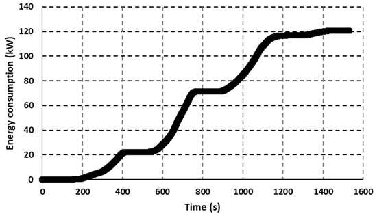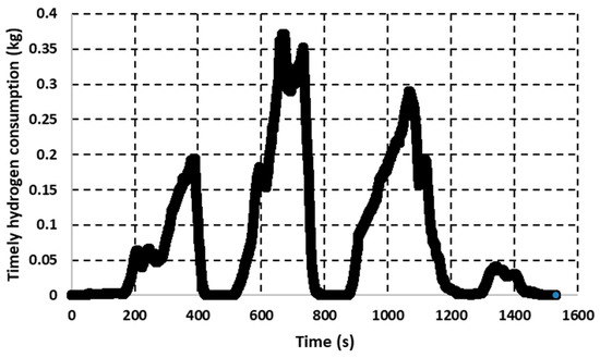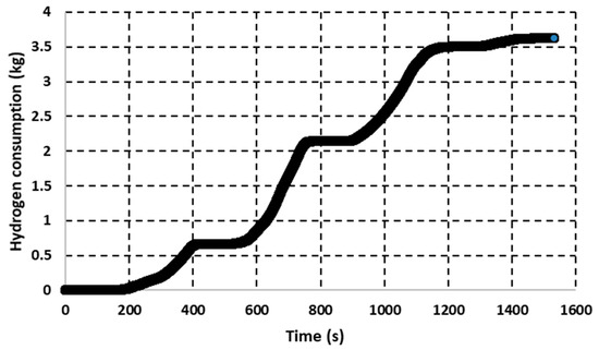 To calculate the required hydrogen, the lower heating value (LHV) of hydrogen is used over the higher heating value (HHV). The LHV of the gaseous hydrogen is 119.96 MJ/kg [31]. Figure 9 shows the energy consumption of the train during a journey of one day based on the real world duty cycle. It is seen that the maximum value of energy consumption is around 121 kW for that particular duty cycle. In addition, the corresponding required timely hydrogen consumption was also calculated, and is presented in Figure 10. To calculate the hydrogen consumption, it is suffice to multiply energy consumption with hydrogen LHV. Figure 11 shows the hydrogen consumption for one trip and, from the plot, it turns out that the train consumes 3.6 kg of hydrogen in each trip. According to a Metrolinx report [6], the total number of trips per day is 154 for weekdays and 146 over the weekends. This translates to a total of 55,442 trips per year. This is equivalent to 0.2 tons of hydrogen consumption per year.