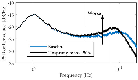 Effect of 50% increase in the unsprung mass on the vertical acceleration of vehicle body. The resultant worsening of ride comfort is reflected by higher Power Spectral Density in the frequency range 4–8 Hz, where the driver is more sensitive to vertical accelerations.