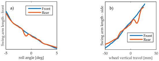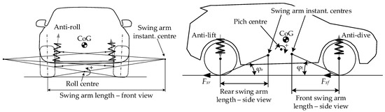 The geometry of the vehicle roll and pitch motions in accordance with the experimentally validated vehicle model is reported in the Figure 4. The suspensions’ kinematics and compliance (K&C) is modelled and parametrized accordingly. As IWMs are installed below the suspension, a force with vertical direction is generated as the electric motors are actuated (see Figure 4, right). To this effect, the vehicle dynamics simulation software accounts for variations in the swing arm instantaneous centre of front and rear suspensions, which stem from the combined effect of body inertial forces and vertical wheel forces. The knowledge of the swing arm instantaneous centre enables the evaluation of the vehicle pitching and roll characteristics and, thus, for a proper anti-dive/lift and anti-roll control of front and rear suspensions. The instantaneous pitch/roll centres are determined by intersecting the lines drawn from the tyre contact points to the swing arm instantaneous centre of rotation. In accordance with the suspensions kinematics of the employed vehicle, the swing arm centre position is a function of the relative wheel travel with respect to the vehicle body. Figure 5 reports the result of the SPMM (Suspension Parameter Measurement Machine) compliance testing for the vehicle under analysis. Data are hidden for privacy reasons. The proper design of front and rear swing arm centre positions is important to reduce pitch and roll by generating anti-dive (when braking), anti-squat (when accelerating), and anti-roll (when turning) forces.