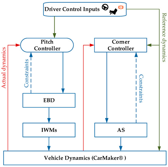 The “Pitch Controller” computes the reference states of the vehicle body dynamics for given manoeuvre conditions based on the “Driver Control Inputs”, as the positions of the acceleration and brake pedals. The mentioned reference states, which are sent to the electronic brake distribution (EBD), are at this stage of the research related to the pitch motion, as will be explained in the next section. The Corner Controller depends on the applied ride control targets, which are related to one or more tasks, as road holding, handling, pitch control, heave control, etc. The reference states are compared with the actual states of the vehicle body dynamics provided by the vehicle on-board sensors and state estimators. EBD and the Corner Controller set up the control current for IWMs and actuators of the ASs. They produce required wheel torques and vertical forces correspondingly. The system acts so that the control effort required from the Corner Controller is minimized once the EBD for minimum pitch intervenes. However, the limitations of this control algorithm will be discussed later on. The “Pitch Controller” and “Corner Controller” are based on the Proportional Integral (PI) controller, whose gains have been identified by analysing the frequency response for the closed-loop system of the driver vertical acceleration and angular rotations with varying vertical load and road input.
