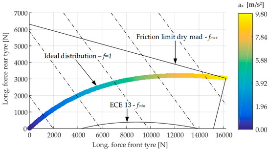 By controlling the magnitude of the motor torque provided to each wheel, the anti-dive/lift force can be used for pitch motion suppression. In fact, load transfer can occur not only during vehicle acceleration/deceleration but also because of the anti-dive/lift forces brought about by the IWM architecture. Relevant to this study is the definition of ideal force distribution, based on which front and rear wheels exhibit the same tyre–road friction utilization [24]. The ideal force distribution against the braking acceleration demand is depicted in Figure 7. A control parameter is defined so that: