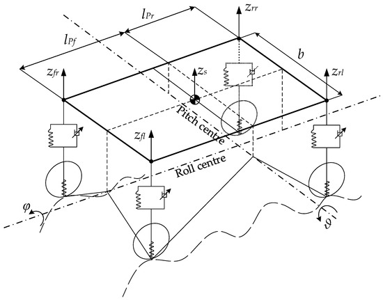where, is the wheel track and and represent the distance of the pitch centre from the front and rear wheel centre, respectively. Hence, the control input acts to suppress the acceleration of the top-mount points. Given the linearity of the problem (3), this control provides a simultaneous abatement of heave, pitch, and roll motion.