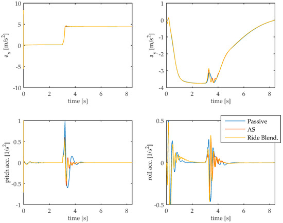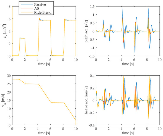 In the first scenario, the vehicle starts from an initial speed of 100 km/h and performs three consecutive braking manoeuvres until a stand still. The results of this simulation are reported in the Figure 9 and refer to three configurations, namely: the conventional SUV with passive suspension system (referred to as “Passive”), the full electric SUV equipped with ASs (also referred to as “AS” in the figure) and the upgraded configuration with ride blending control (referred to as “Ride Blending”). It is worth remarking that the controller preserves the same braking performance, achieving a pitch reduction without affecting the braking distance.