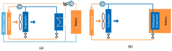 The Mahle Behr chiller system [8] is used in plug-in hybrids and electric vehicles. The temperature control is established with a water/glycol circuit. To cool the battery, the circuit is coupled with the HVAC via a plate heat exchanger with an integrated expansion valve (called chiller) and a radiator integrated in the circuit (see Figure 1a).