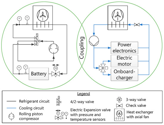 A stand-alone refrigerant circuit for the thermal management of the battery was proposed by the authors [7]. A stand-alone system with integrated heat pump functionality is depicted in Figure 3. It offers several advantages, but also disadvantages, which are listed in this chapter. The order does not represent the importance, as it depends heavily on the goals of the application.