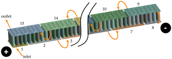 In the first geometry, a cooling channel was placed between each cell. The inlets and outlets of the refrigerant were relocated along the streaming direction, thus making it necessary to have additional mirror-inverted busbars, which can be seen in Figure 7. The distance between the cell rows was set to 2 mm, whereas the distance of the columns was limited to 6 mm due to the distance of the channels to the rectangular hole for the electric cell contacts. The overall channel length of pattern 1 was 8.54 m.