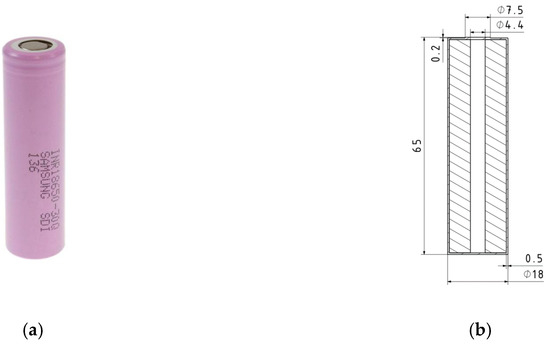 Battery cell modelling: (a) Samsung INR18650-30Q; (b) sectional view of the cell model.