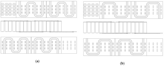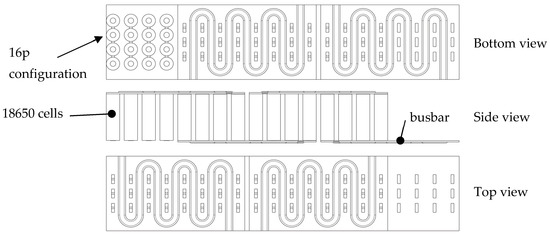 In the channel pattern shown in Figure 8a, the channels were placed between every second row. This allowed to decrease the column distance to 2 mm where no channel was located. The cell distance at the channel was still 6 mm. The busbar inlet and outlet were located on the same side, resulting in the same busbar pattern for the whole battery pack. The overall channel length of pattern 2 was 5.62 m.