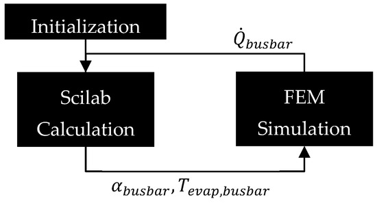 The decreasing evaporation temperature due to the pressure drop was regarded for each plate separately. The solution was calculated iteratively as shown in Figure 9 because the heat transfer coefficient and the pressure drop are influenced by the heat flow density of each busbar. High heat flows to a busbar increase the vapor fraction as well as the Boiling number . The simulations converged after 5–7 iterations, each with a duration of 10 min.
