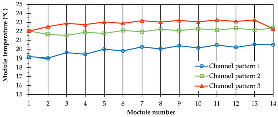 The lowest temperature was achieved with the channel pattern 1. However, the difference between the coolest and the hottest module was larger compared to the other patterns. The most homogeneous module temperature distribution was found in channel pattern 2, where the deviation was only 0.81 K.