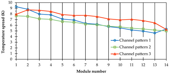 The temperature spread between the hottest and the lowest temperature in a module is shown in Figure 11. For all channel patterns it is lower than the target value of 10 K. It decreases along the modules because the evaporation temperature deviation between the top and the bottom of the modules decreases. Channel pattern 2 offered the lowest temperature spread up to module 8, where the module temperature spread of channel pattern 1 was slightly lower.