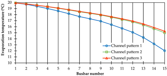 As channel pattern 1 holds the longest channel length, the pressure drop, and thus the evaporation temperature decrease of 8 K, in the busbars was the highest. The temperatures in channel patterns 2 and 3 were nearly identical. At busbar 15, the highest deviation was 0.25 K.