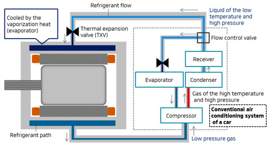 To enhance the conventional cooling performance, we have developed a new cooling method: refrigerant cooling. The refrigerant cooling system is connected with a car air conditioning (A/C) system in parallel as shown in Figure 1. It uses a jacket for water cooling as refrigerant path that is installed in a motor housing. A thermal expansion valve (TXV) is attached at an inlet of the motor housing, at which liquid refrigerant evaporates to some extent. The rest of liquid refrigerant evaporates in the path absorbing heat from the motor. A compressor regulates its operation rate to control the cooling performance.