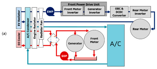 (a) Current cooling system of PHEV; (b) one example of ideal cooling systems using refrigerant cooling.