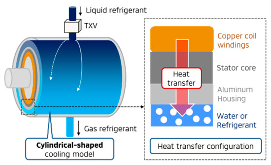 First is air cooling, which is mainly utilized in train motors, not in the driving motors of electric vehicles except for some in-wheel motor cars [1,2]. Air cooling is superior to other methods in terms of the cost and the cooling uniformity; however its performance is the lowest among the three conventional cooling methods. Second is oil cooling, which has the best cooling performance since oil flowing into a motor housing cools a heat source directly [3,4]. Mitsubishi motors apply the oil cooling to the front motor of Outlander PHEV [1,5]; however, oil cooling compromises the cooling uniformity and the system cost. Moreover, it requires a water cooling system separately to cool an inverter. The final conventional method is water cooling, which is the most common method among electric vehicles [6]. Mitsubishi motors apply water cooling to the driving motor of i-MiEV and the rear motor of Outlander PHEV [1,5]. In this method, water flows into a jacket installed in the housing and exchanges generated heat. It achieves better cooling uniformity and less system cost than oil cooling; however, its cooling performance is not effective as much as that of oil cooling.