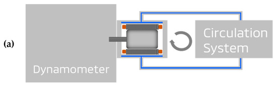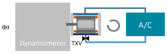 The cooling performance was compared between water and refrigerant by using the same motor of the specification in Table 4. All experiments started with water cooling as shown in Figure 4a. A TXV was installed at the inlet of the water jacket as shown in Figure 4b before experimenting refrigerant cooling. The refrigerant cooling experiment used the same motor as the water cooling experiment. The water jacket worked as the refrigerant path. In addition, the water circulation system was replaced by an A/C system. Compressor regulated its operation rate to control the refrigerant cooling performance. The compressor kept operating until the motor surface temperature declined to a target temperature. Note that the target temperatures for refrigerant cooling were set at 0, 10, and 20 °C. The compressor stopped its operation when the motor surface temperature was lowered below the target temperature. Three experiments were performed as shown in Table 5.