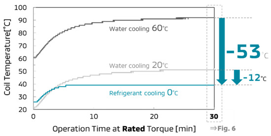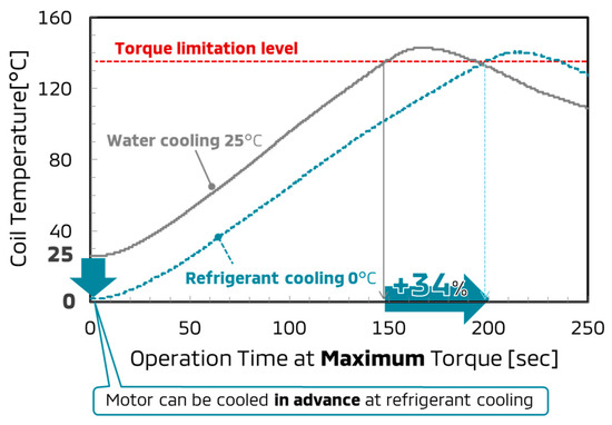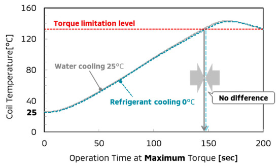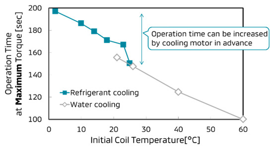 However, when the motor was cooled down to 0 °C in advance of motor operation, the operation time at the maximum torque of the refrigerant cooling was extended by 34% as Figure 10 shows. Figure 11 shows that the lower initial coil temperature led to the longer operation time. In other words, the refrigerant cooling had an advantage over the water cooling since the compressor decreased the initial coil temperature before the motor operation.