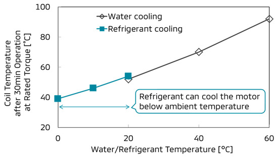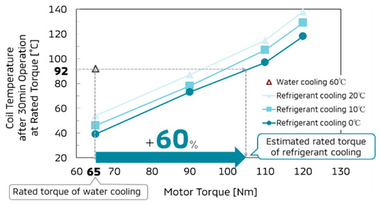 Figure 8 shows that the rated torque of the refrigerant cooling increased up to 60% more than that of the water cooling. The new rated torque was estimated from the highest coil temperature of the water cooling. After the operation of the water cooling motor with the water temperature of 60 °C operated for 30 min at the rated torque of 65 Nm, the coil temperature reached 92 °C. This result indicates that the rated torque of the refrigerant cooling is allowed to increase until the coil temperature becomes 92 °C. In that case, the motor torque was 105 Nm while the refrigerant cooling was 0 °C. That was a 60% increase of the rated torque of the refrigerant cooling as a result of replacing the cooling substance from water to refrigerant.