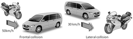 The strength of the attachment of the container shall be verified by the alternative acceleration test, where a specific acceleration is applied to the container attached to the vehicle on a loading platform. The container shall remain attached to the vehicle with a minimum of one attachment point and stay within the installed location after the acceleration test. The acceleration values used in the test were obtained from the frontal and lateral collision tests shown in Figure 3. In the frontal collision test, a motorcycle collided with the side of a car. In the lateral collision test, the car collided with the side of the motorcycle. The collision speed indicated in the figure is based on accident statistics involving motorcycles in Japan over the past 10 years.