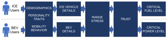 Research on user and system factors predicting range satisfaction as well as the nature of range stress and coping strategies is well advanced. Thus far, the focus was on the perception and evaluation of critical range situations with regard to active BEV users in field trials, which is necessary to validate the effect of practical experience, for example. However, there is a lack of knowledge concerning the comparison of different driving contexts, range situations, and user groups—for instance, contrasting traditional refueling and drivers of cars with ICE, who might be future BEV users. To better understand the meaning of range stress for different (i.e., active and potential) user groups, the extent to which users perceive limited range as stressful, and also how to derive guidance for practice, further research is needed, which this study responds to as a supplement to the current state of research. In this context, stronger focus should be placed on user diversity effects on acceptance-related criteria, such as users’ trust in their vehicle. Here, alternative methodological approaches are needed, as scenario-based quantitative study designs, to validate previously obtained research results, e.g., from field study trials, in larger sample sizes. By comparing the needs and demands of future users with experienced BEV, the results contribute to a deeper understanding of range stress related determinants in order to facilitate the overall access of BEV.