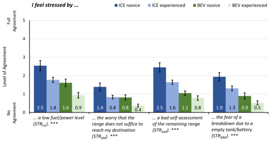 A significant effect of the experience group could be observed for the stress caused by a low fill level (, , ), for the stress caused by an insufficient range to reach the target (, , ), for the stress caused by a poor self-assessment of the available range (, , ), as well as for the stress caused by the fear of a breakdown of the vehicle (, , ). When comparing the individual experience groups pairwise, it is noticeable for all stress factors that the ICE novices differ significantly from all groups in the sense of higher average stress levels ( for all pairwise comparisons). In contrast, e.g., ICE experienced users differ significantly from BEV novices only with regard to one factor: ICE experienced drivers had significantly higher stress levels based on poor self-assessments of reach than BEV novices (). The BEV experienced users, however, never differed significantly from the BEV novices, but from both ICE user groups for all stress factors ( for all pairwise comparisons).