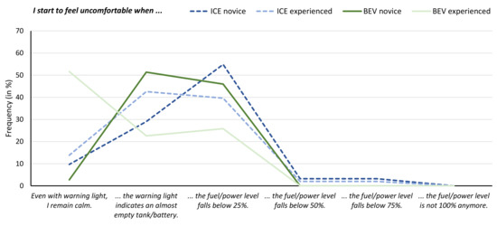 In addition to the stress factors, the level of fuel or power, which is perceived as critical, can also be relevant for the refueling or charging behaviour. As can be seen in Figure 3, all experience groups remained calm even at a tank or battery level of 50%. Only below this did users begin to feel uncomfortable and differentiate. Looking at the relative frequencies, it became apparent that most ICE novices started already thinking about refuelling when the filling level fell below 25%. For ICE experienced drivers and BEV novices, in contrast, the peak of the relative frequencies was found at an activated warning light as a time for the onset of discomfort. For BEV experienced users, an absolute majority even remains calm in case of a low filling level that is already highlighted by the warning light.