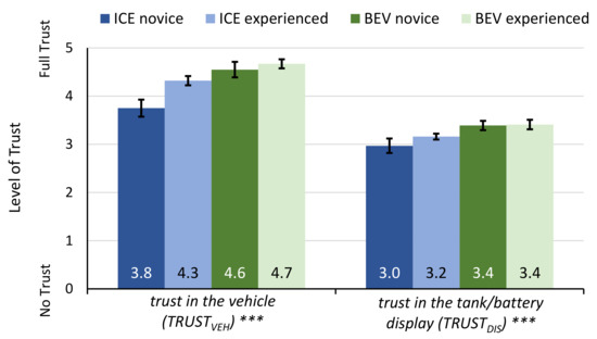 Trust in the vehicle and in the tank/battery display, differentiated by experience group (Means and related Standard Errors, scale min = 0, scale max = 5, *** corresponds to ).