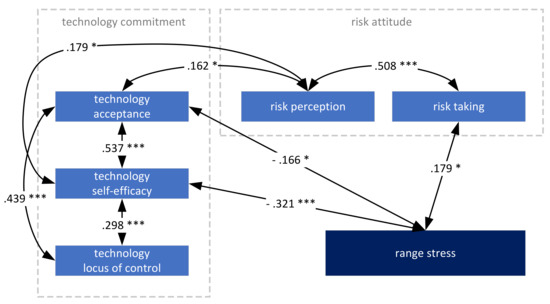 Cronbach’s coefficient was calculated to determine the reliability of multi-item scales, which was at least satisfactory for all scales, such as for technology commitment (), risk taking (), and risk perception (). The general willingness to take risks [37] was strongly correlated with the dimensions of the DOSPERT scale, which is why no separate report is provided in the remaining paper, even though the scale was included in all calculations for control purposes.