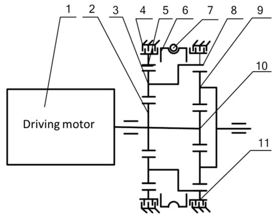 Schematic diagram of the planetary two-speed transmission. 1-driving motor; 2-sun gear in planetary system 1(S1); 3-carrier in planetary system 1 (C1); 4-brake 1(B1); 5-ring gear in planetary system 1 (R1); 6-worm shaft; 7-worm gear; 8-ring gear in planetary system 2 (R2); 9-carrier in planetary system 2 (C2); 10-sun gear in planetary system 2(S2); 11-brake 2(B2).