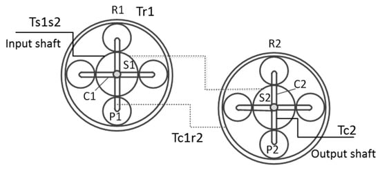 According to the Lagrange method, the dynamic model of planetary gear sets is built based on the structure of the two-speed transmission, which includes two sets of planetary gears shown in Figure 2. Considering the generalized meshing equations, there are four constraint equations for the planetary systems, where represents the angle of the S1 and S2, represents the angle of C1 and R2, represents the angle of pinions in the left planetary, represents the angle of R1, represents the angle of C2 and represents the angle of pinions in the right planetary. We assume that there is no sliding between the sun gears and pinions and pinions and ring gears in these two planetary system.