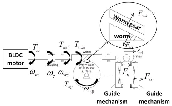 where is the output torque of the worm shaft, is the inertia of the worm shaft, is the angular speed of the worm shaft, is the input torque of the worm gear, is the ratio of the worm gearing, , is the angular speed of the worm gear, and is the transmission efficiency of the worm system.