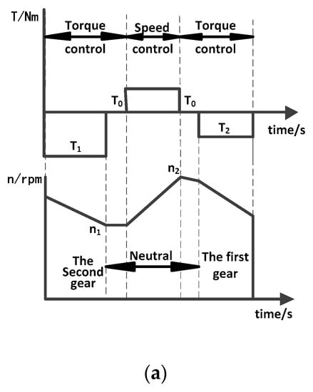 To improve the shift quality, the optimal quadratic control would be applied for the off-going stage and on-coming stage. During shifting, the torque of the driving motor changes in different stages. Then the driving motor works following the speed closed-loop and the two-speed transmission begins a down shift when the speed increases to the objective value . The driving motor operates by direct torque close-loop control after shifting. The control strategy of the driving motor is shown in Figure 4a, and Figure 4b shows the speed control strategy of the BLDC motor during shifting.
