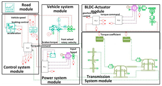 The dynamic model of EVs included the power system module, two-speed transmission, vehicle system, and driver-environment module, which were built in AMESim. The simulation model of EVs is shown in Figure 7.
