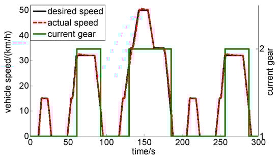 With NEDC (new European driving cycle) drive cycle, the input of the model was the desired velocity of the vehicle, and the difference between the desired value and actual velocity exported the signals of acceleration and brake to the drive-environment module. In addition, the vector control method was applied to the driving motor by the PI control for angular velocity and torque. The states of the driving motor followed the desired torque and angular velocity by adjusting the current when the desired torque and actual torque were compared. The shifting controller of the BLDC motor was similar to the driving motor controller, and the PI control was used to track the objective curve for gear-shifting. Actual values of the powertrain system parameters are given in the Nomenclature. During the NEDC drive cycle, the simulation results showed that the velocity of the vehicle followed the desired value, which consisted of three times upshifts and downshifts.