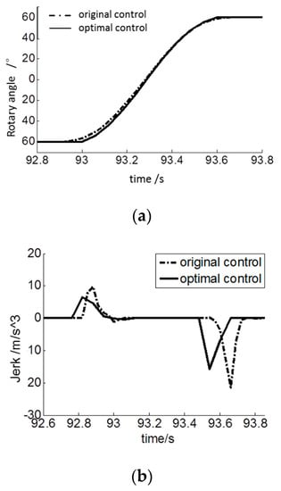 Performances during down-shifting. (a) Optimal rotary angle during down-shifting; (b) Jerk with different controller during down-shifting.
