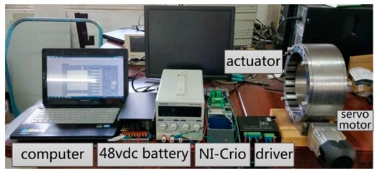 According to the optimal angular velocity of the BLDC motor, the testbed of the actuator for shifting in our lab is shown in Figure 9. The output shaft of the BLDC motor connects the worm shaft, and the brakes system was neglected. In the test, the controller of the BLDC motor outputs optimized angular velocity, which was measured and shown on a computer. To drive the BLDC motor, the NI-CRIO was adopted as the main controller. LabVIEW was applied for communications between the computer and the NI-CRIO NI9401 boards for data acquisition. The test bench is shown in the Figure 10.
