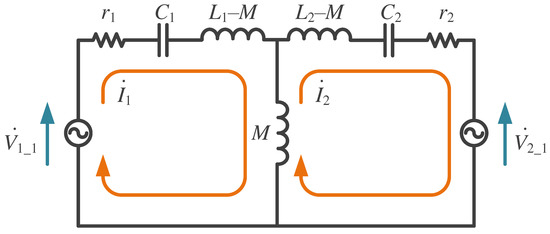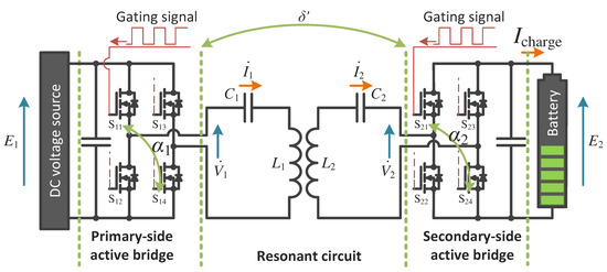 In the SS-type resonant circuit, the capacitances of compensation capacitors , [F] are designed to resonate with the self-inductances of transmission coils , [H], respectively, at 85 kHz. In this case, each characteristic of the resonant circuit can be considered with only , [V], which is the fundamental component of , , respectively, because the resonant circuit works as a band-pass filter at the resonant frequency of 85 kHz. Therefore, based on Figure 2, when soft-switching operation is applied to the active bridges, and are expressed as