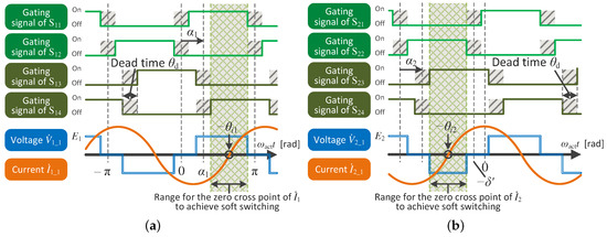 In Figure 2, the conditions for achieving soft switching in the primary-side and secondary-side active bridges can be confirmed. In addition, the period indicated by hatching shows the dead time in each leg. According to Figure 2, the reverse current flows through the switch during the dead time by setting a zero-crossing point of the currents within the period indicated by hatching. In this time, if the reverse current is sufficiently large, the electric charge is discharged completely, and D–S voltage becomes zero. Consequently, the soft switching can be achieved in all switches in the active bridge. From the above, the requirement where soft-switching can be achieved at all switches in both active bridges can be expressed as